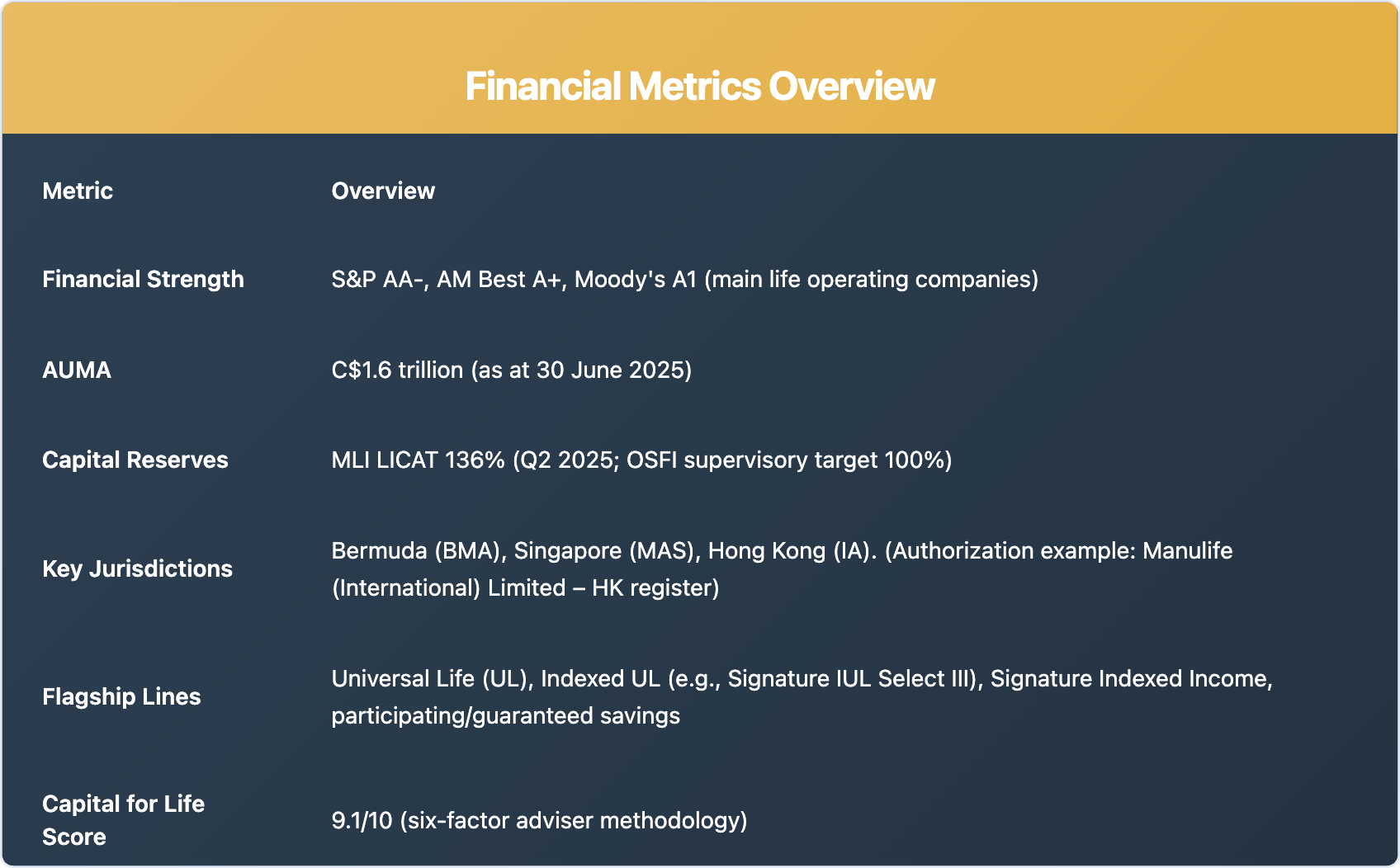 Manulife’s scale (AUMA C$1.6T), strong ratings (S&P AA‑ / AM Best A+ / Moody’s A1), and MLI LICAT 136% underpin suitability for long‑duration policies, trust ownership, and bank premium financing. These metrics matter when policies are intended to last decades across multiple legal and tax regimes.